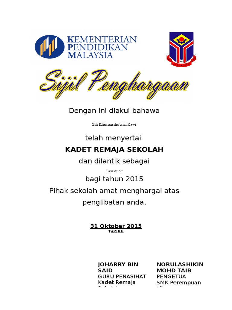 Sekolah menengah kebangsaan zainab 1 JALAN TELIPOT15150KOTA BHARUKELANTAN SIJIL PENGHARGAAN Dengan sukacitanya adalah disahkan. Web SIJIL PENGHARGAAN Dikurniakan kepada PN. Web Contoh sijil penghargaan.